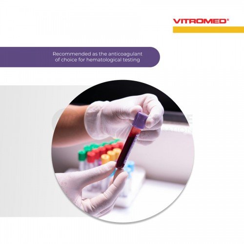 Vacutainer type EDTA K2 Tube lavender top is recommended as the anticoagulant of choice for hematological testing, it allows best preservation of cellular components and morphology of blood cells. Applies in examination of whole blood. EDTA anticoagulant are stable up to 24 hours.