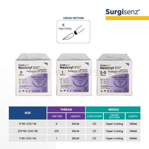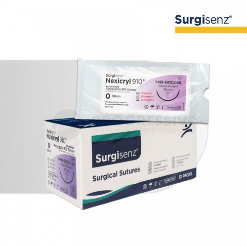 Surgisenz Nexicryl 910 Polyglactin is a synthetic, absorbable sterile surgical suture made from 90% glycolide and 10% L-lactide. It is coated with glycolide-lactide copolymer, calcium stearate, and triclosan for antibacterial protection. The suture is non-antigenic, non-pyrogenic, produces minimal tissue reaction, and is designed for general soft tissue approximation and ligation, except for ophthalmic, cardiovascular and neurological tissues.