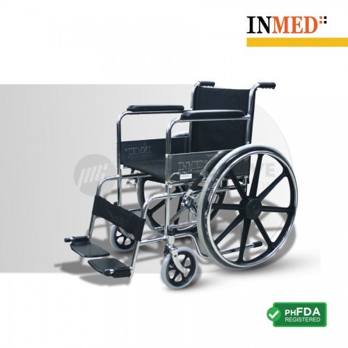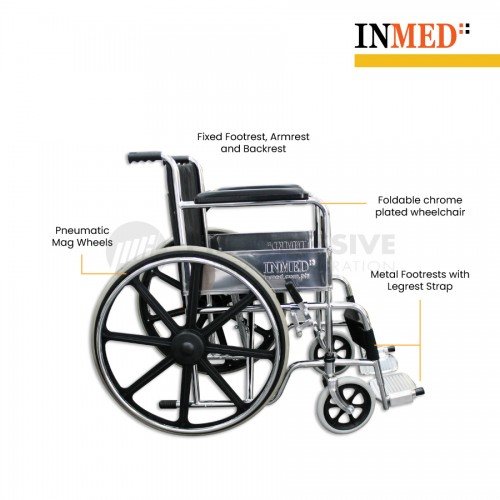 Inmed Mag Wheel Wheelchair is a standard wheelchair with foldable chrome steel frame designed for basic functionality, with solid 8 spoke magwheel composite construction for strength and durability.